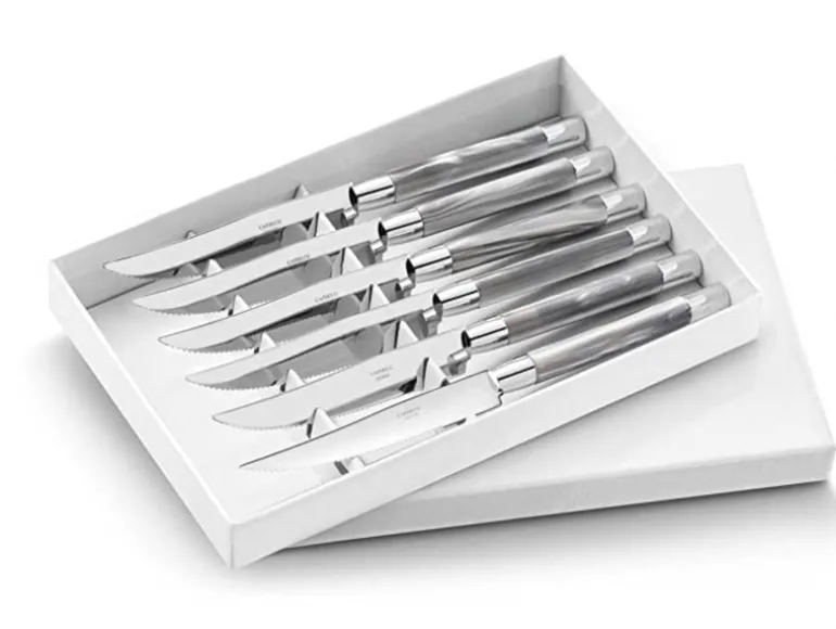 Sleek and modern the knives marbleized handle in shades of grey accentuate this sleek steak knife set that is made in Thiers, France.