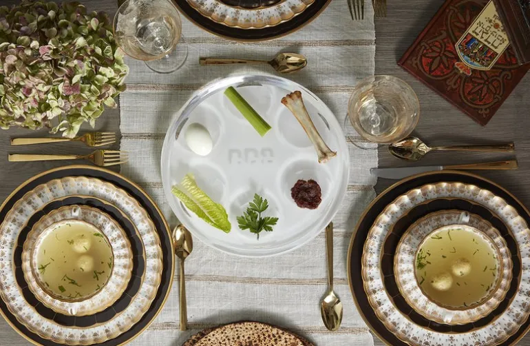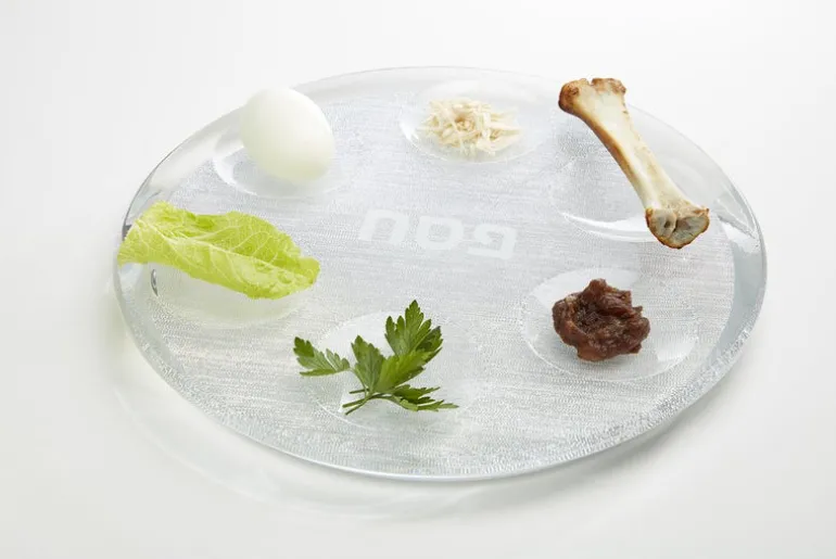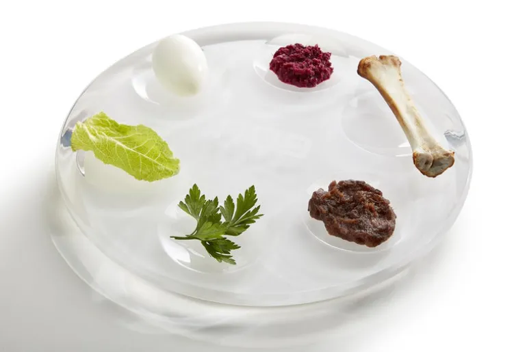 The chicest Passover accent. The seder plate is made of translucent acrylic and perfectly sized. “Pesach,” the Hebrew word for Passover is delicately etched in the center of the dish, surrounded by six wells designed for each of the symbolic Passover elements. It adds an elegant modern touch to the holiday table setting.