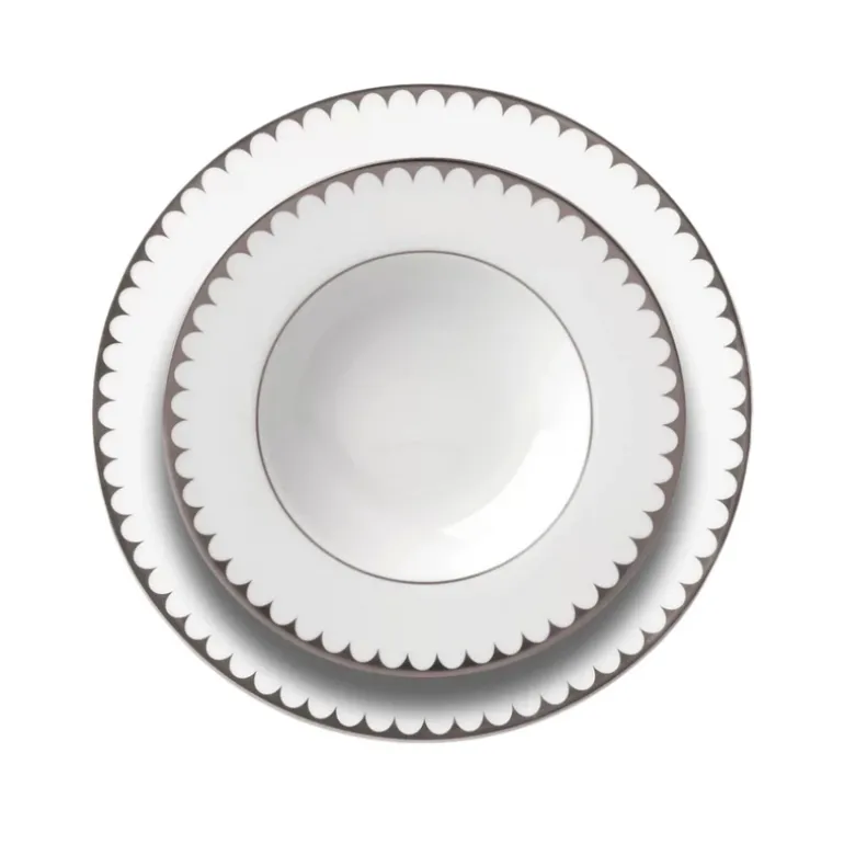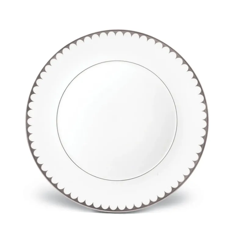 Mirroring the waves of its namesake sea, the Aegean Filet dinner plate features a timeless pattern of scales in a delicately scalloped border, hand-applied in 24K gold and platinum.
