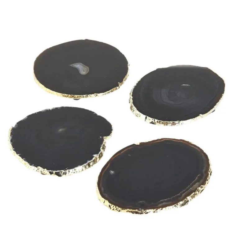 This set of 4 black agate coasters with gold trim is thoughtfully created of polished and cut agate gemstones with unique natural edges. Offering a perfect blend of beauty and practicality, these coasters are an ideal addition to your table and no two are alike.