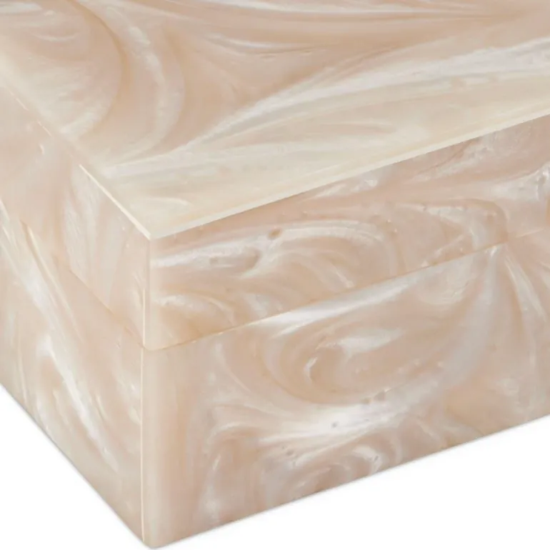 Crafted with composite material for a luxurious pearlized texture, the Akoya Swirl Box Set of 2 adds an ethereal gleam to any room. The peach-colored boxes are lined with natural wood, elegantly wrapped in seamless composite.