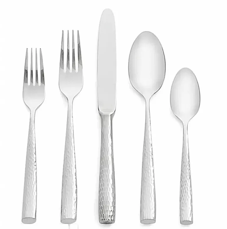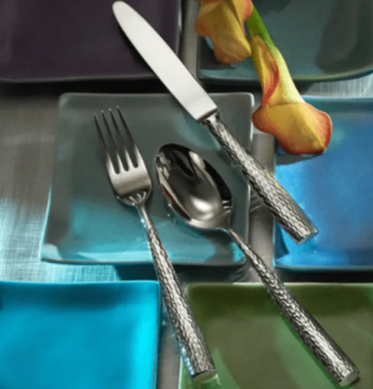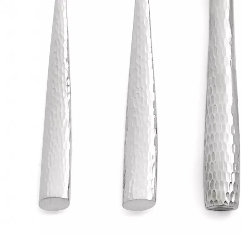 The Anvil 5-piece flatware offers magnificent craftsmanship. It has a shimmery, textured surface that is refined and versatile for use day and night. Meticulously designed and crafted by Ricci Silversmiths of the highest quality 18/10 stainless steel.
