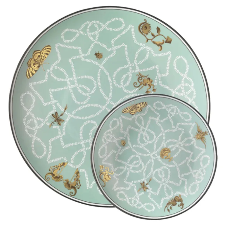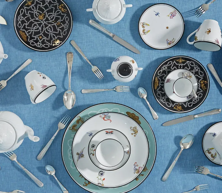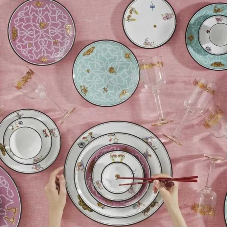 Mix the colors and pieces to create a table that will dazzle your guests. The whimsical collection was created together with fashion designer Orazio Stasi. His designs depict an idyllic, childlike world where imaginative creatures prance here and there among the floral patterns of an Italian garden, scattering traces of their happiness everywhere they go.
