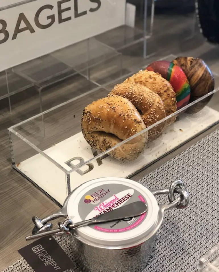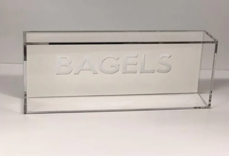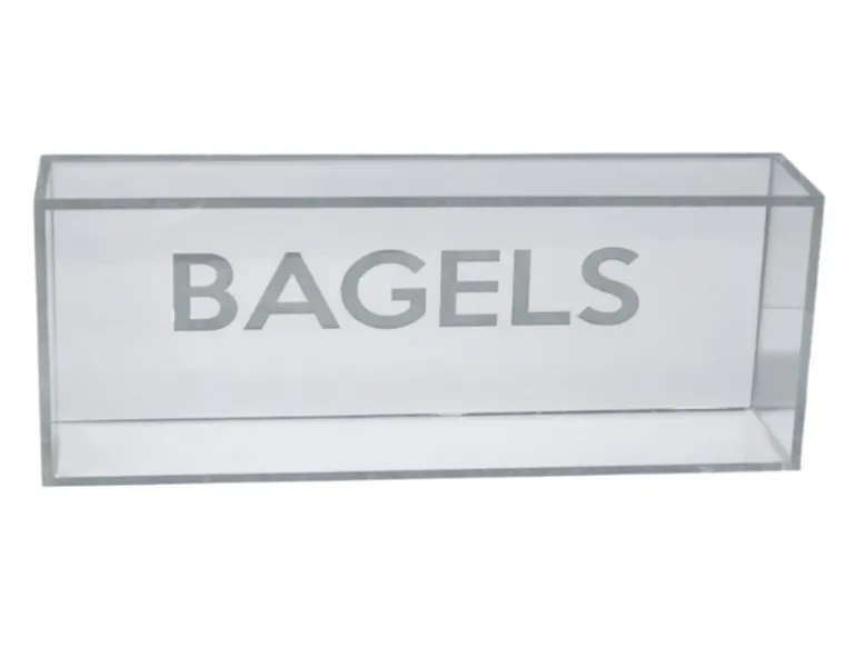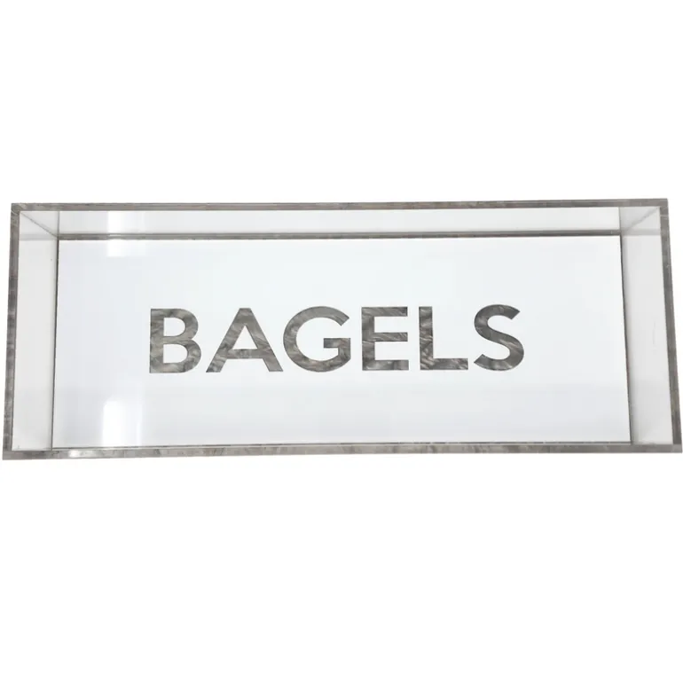 The word BAGELS comes through the white background in silver marble acrylic and this item makes a wonderful great gift.