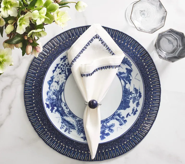 Mimicking baguette stones that are typically found on jewelry; the graceful Bevel Placemat exudes understated elegance. Glass and acrylic cobalt beads are arranged in a pave pattern on the Bevel Placemat, creating a halo effect.