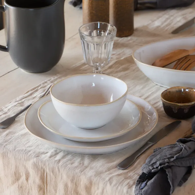 Handcrafted in Portugal from fine stoneware, the Brisa Branca collection features organic shapes inspired by the Algarve Coast. Its reactive glaze in white and blue creates a unique finish, making it perfect for special occasions or daily use.