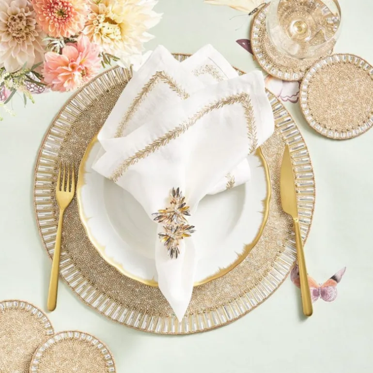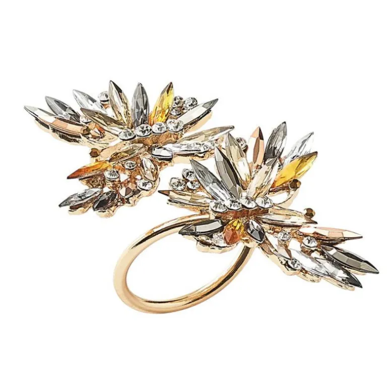 Glass and acrylic gemstones and rhinestones adorn the spectacular cast of Butterflies Napkin Ring. The gems and rhinestones are arranged in layers to mimic elaborate butterfly wings. The cast metal Butterflies Napkin Ring features a rose gold metallic finish.