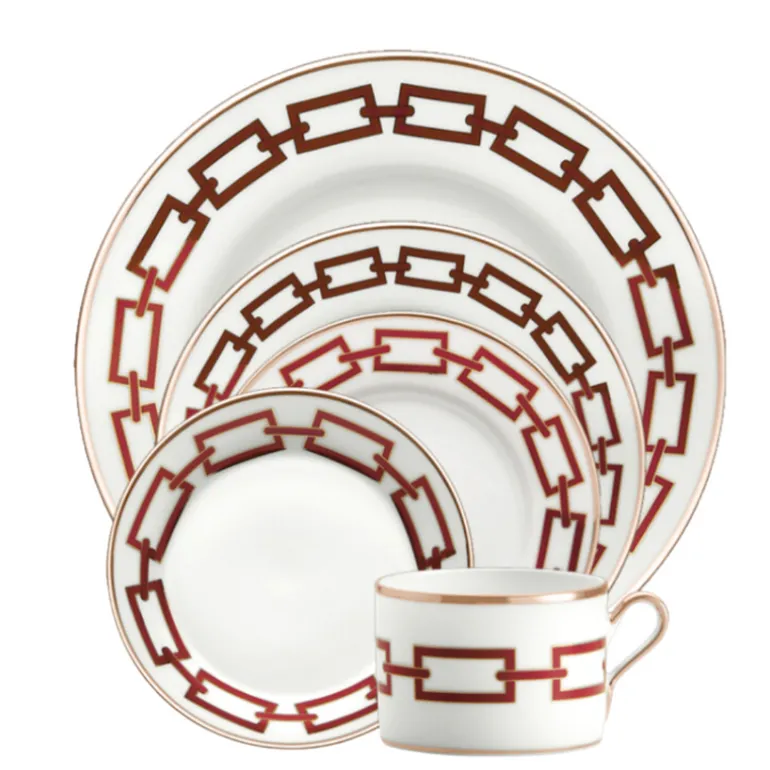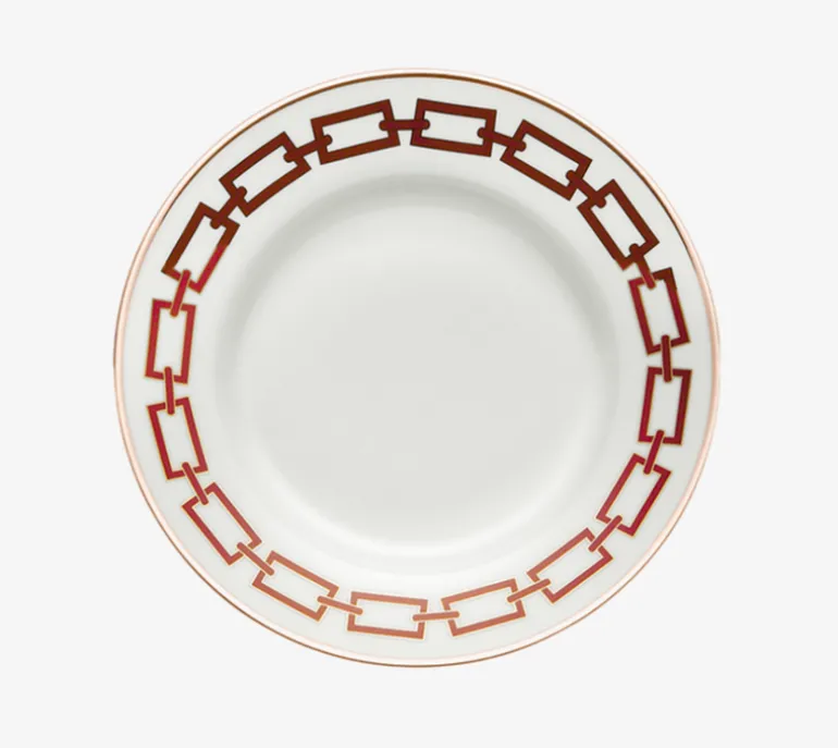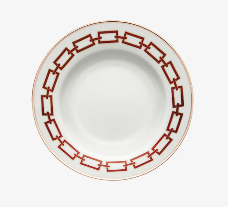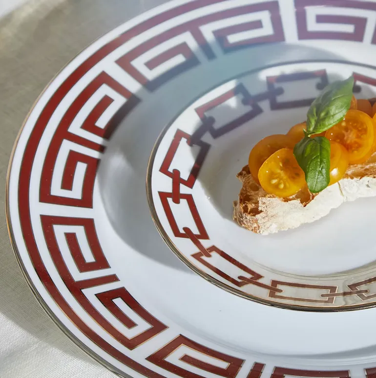 The Catene has a decoration made up of rectangular rings linked to one another. A chain, indeed. Sophisticated and elegant in its essentiality, but also explosive and disruptive in its geometric movement. A single design, a hint of color that links the porcelain plates, cups and serving platters in the collection, available in four color variants: black, scarlet, emerald and sapphire.