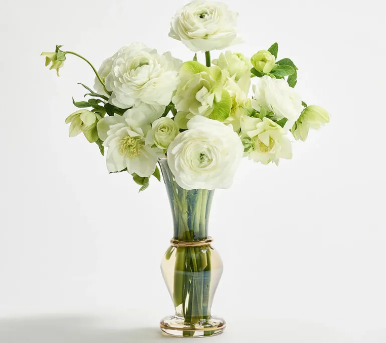 The mouth-blown glass Vases are produced by hand-molding and applying the color, then baking at high temperatures, resulting in its gorgeous iridescent luster. 18K gold bands accent the rim and base of the stylish diamond-shaped vase. Expect shape, size and color variation due to their hand-crafted nature.