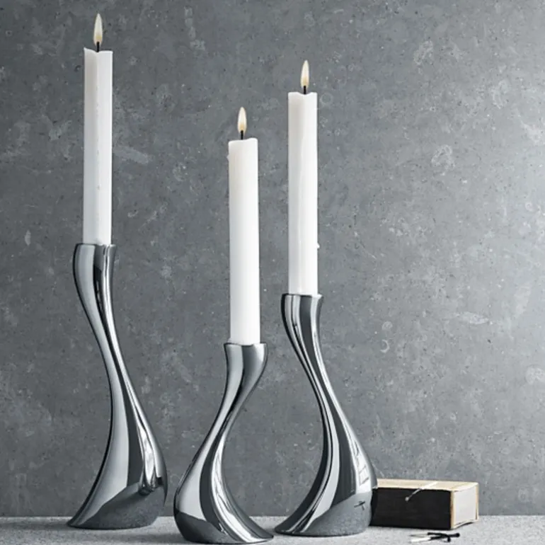 With gravity-defying curves in mirror polished stainless steel, the Cobra candlesticks by Georg Jensen can be difficult to look away from. Candles not included.