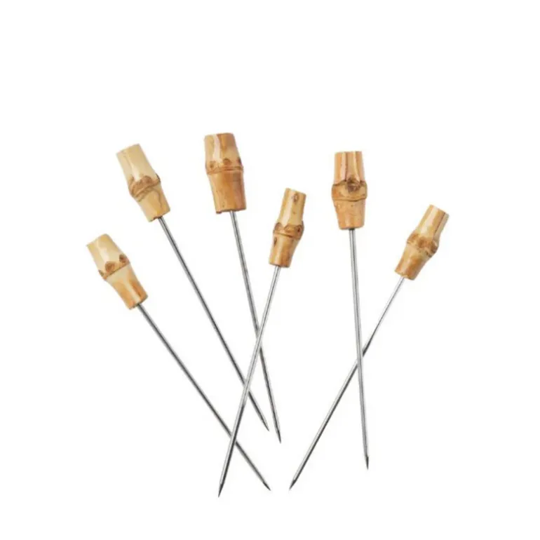 The Cocktail Picks Set of 6 – Bamboo are versatile natural bamboo cocktail picks are an essential for any entertainer – a must-have for every occasion, from lively tiki parties to laid-back beachside cocktails or sophisticated Friday night charcuterie boards. Crafted from natural bamboo, each pick boasts its own unique charm, infusing your gatherings with a coastal flair straight from nature. With a combination of food-grade stainless steel and bamboo, these picks not only lend a touch of style to your presentation but also ensure durability for all your culinary creations.