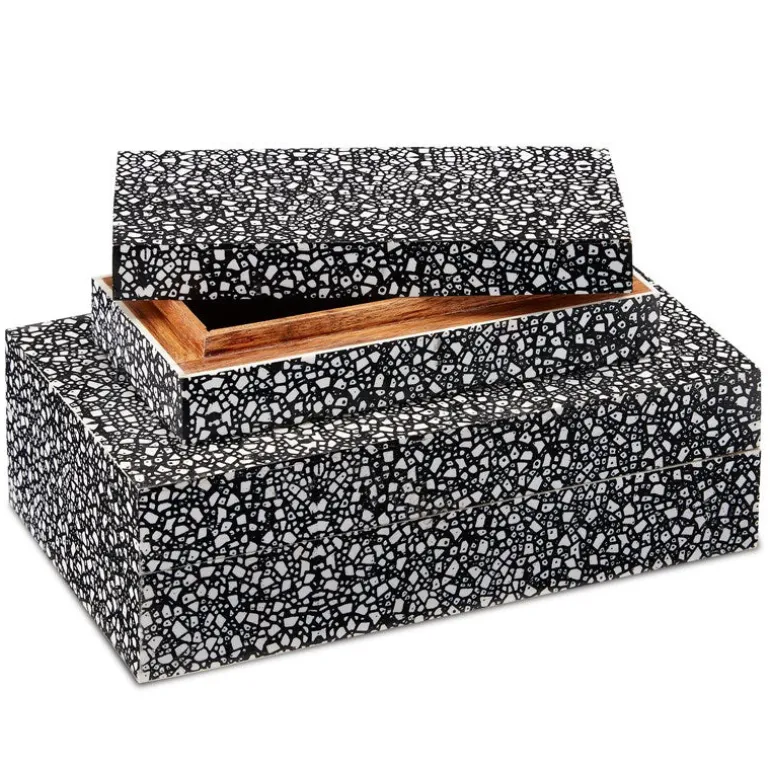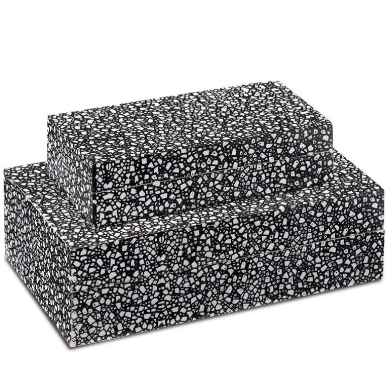The Composition Box Set includes a large and small decorative box with black and white irregularly shaped pieces of composite sprinkled along its surface. The pattern on the black boxes, which reads to the eye like confetti, makes this a bold addition to a vignette on any table, and the exquisite construction makes them beautiful helpmates on a desk.