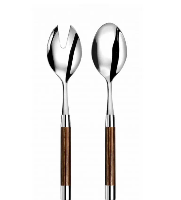 Introducing the Conty Wood Salad Server Set, a statement piece with a natural caramel finish. Its elegant, cylindrical design is reminiscent of the charming French village it’s named after. Made of durable stainless steel with contemporary chrome elements, this flatware is sure to add character to any table setting.