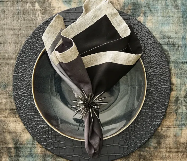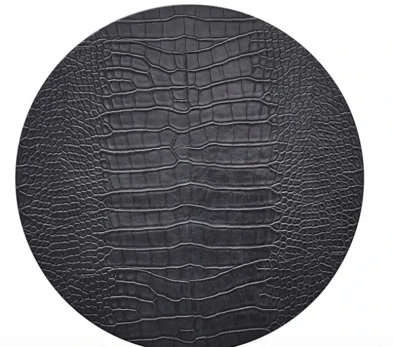 The round embossed faux Croco Placemats are the perfect staple. The organic yet sophisticated crocodile pattern in Charcoal works in any season. They are easy to care for; simply wipe them down before storing them.