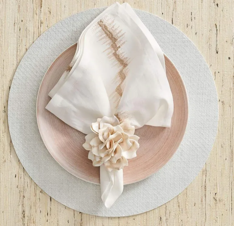 Inspired by a blooming Dahlia, the aptly named Dahlia Napkin Ring is a stunning replica of the delicate flower. Acrylic ivory petals are hand-arranged atop an acrylic base to form a spectacular bloom on this napkin ring. Add an elegant decorative element to any table with this beautiful floral napkin ring.