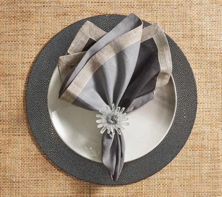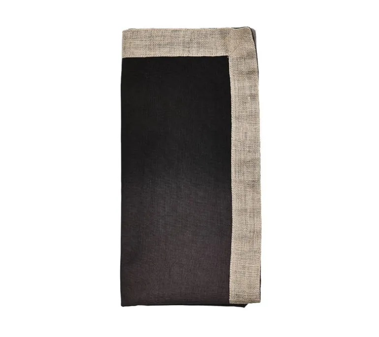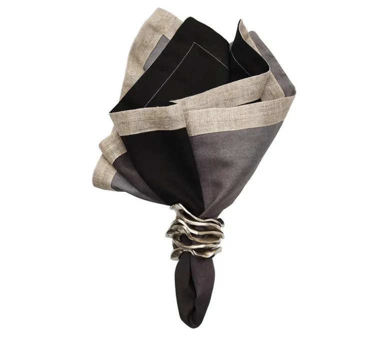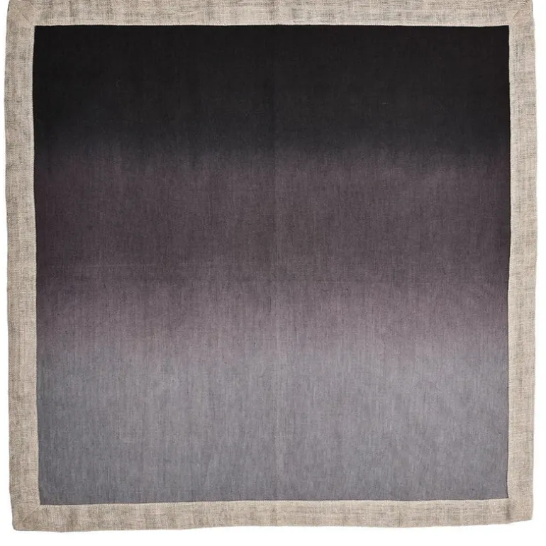 The linen Dip Dye Napkin features an ombre gradation in gray and black, the napkins are hand dipped and dyed and accented with a luxurious metallic foil border. This gorgeous organic color combination complements any table.