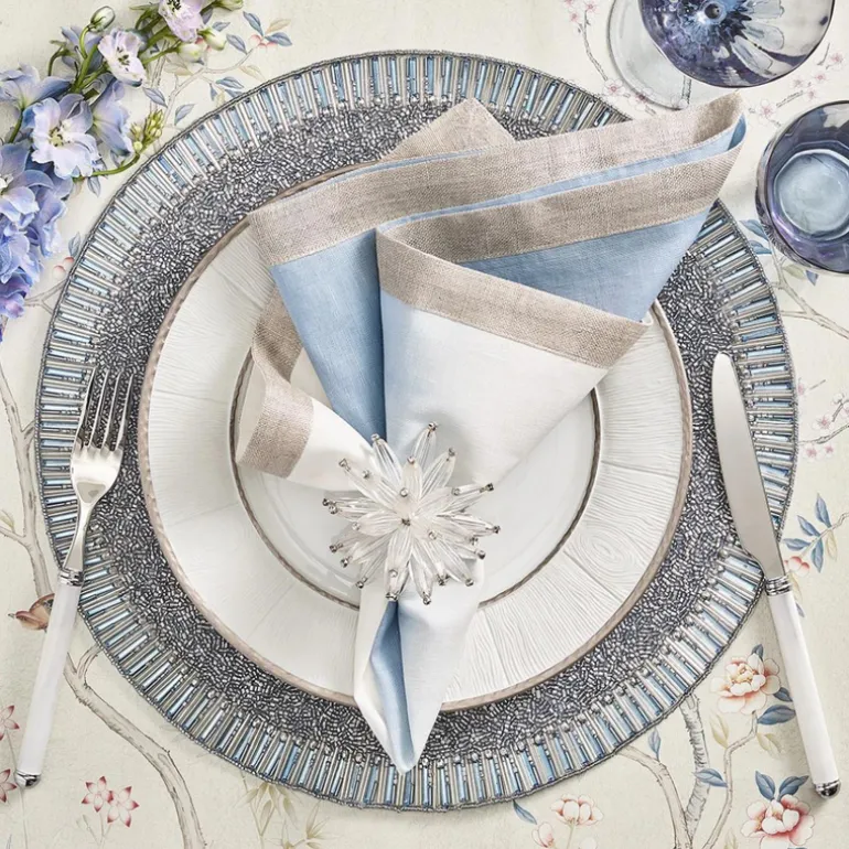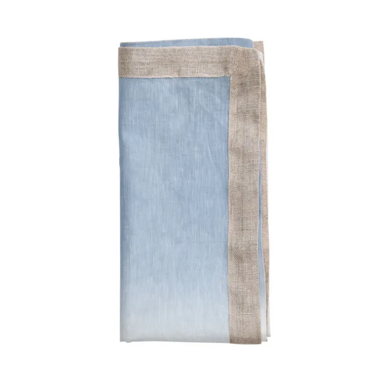 The linen Dip Dye Napkin features an ombre gradation from white to a periwinkle blue, adding a subtle elegance to the refined linen napkin. This gorgeous organic color combination complements any table. These linen napkins are hand-dipped and dyed and accented with a luxurious metallic foil border.