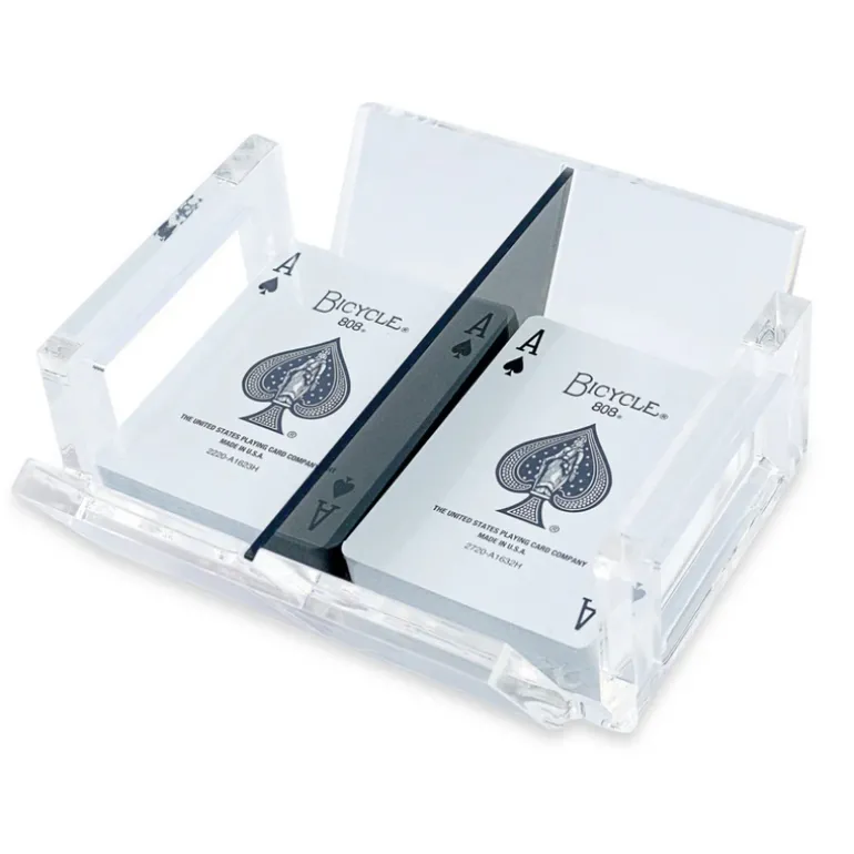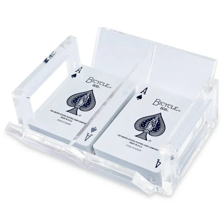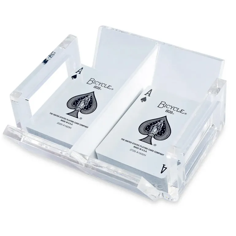 This open canasta tray has 2 sides to pull from, an opening for turn cards, and a spinner. Great for playing with 2 or 3 decks at a time. It comes with 2 decks of playing cards.