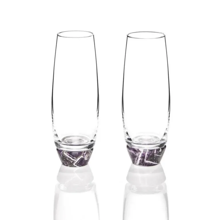 Our gemstone champagne glasses are sculpted from Agate, thought to encourage calmness and peace. Our crystal champagne glasses are also made from Amethyst, believed to confer power and strength. In the Middle Ages, Amethyst was a symbol of royalty, used to decorate crowns and scepters. Our modern designs are believed to enhance your home for generations to come.