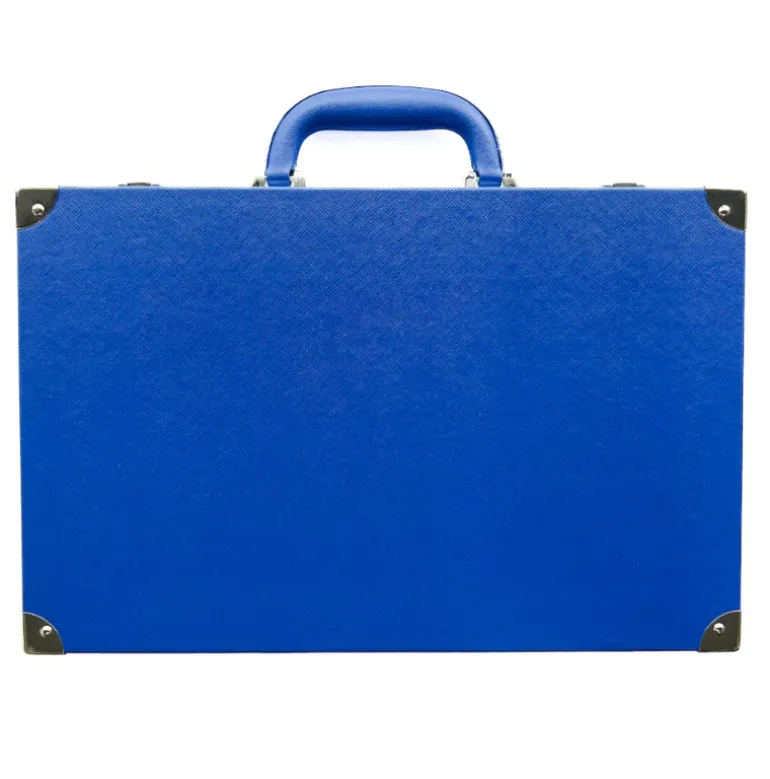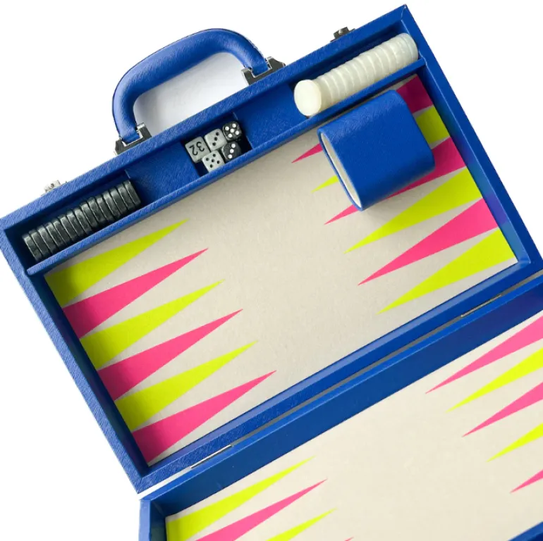Game nights are more fun with the Ellen Blue Backgammon Set. This best-selling set now comes in a vibrant blue color, adding a touch of excitement to your matches. The vegan leather case has a carrying handle and features a felt interior with painted triangles, dice cup, black and ivory chips and dice