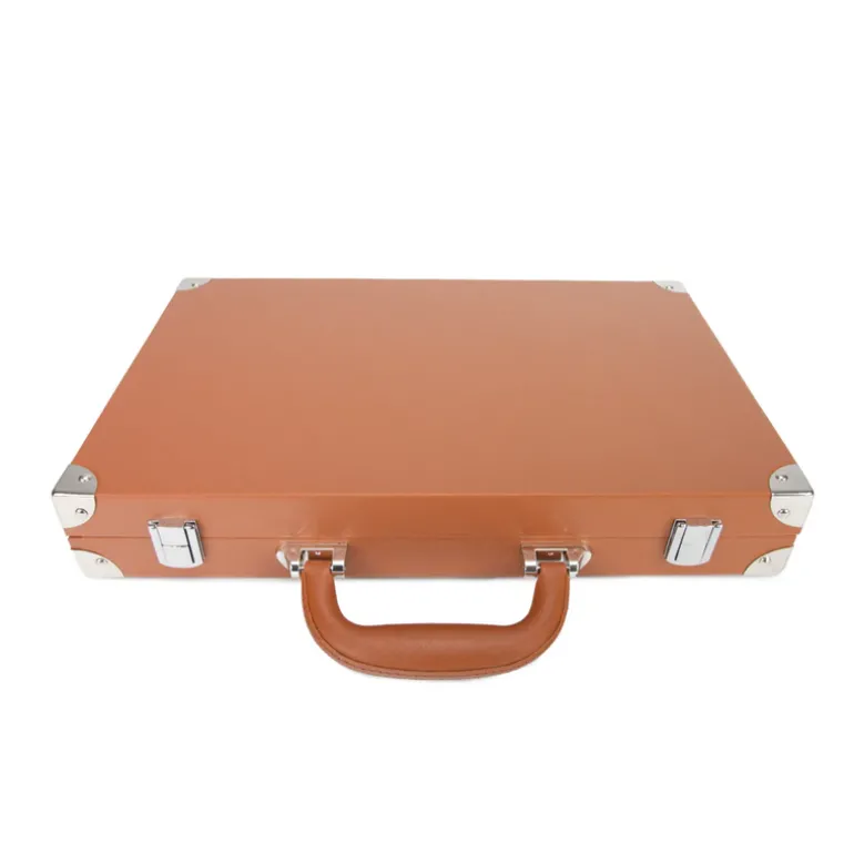 The Excelsior Backgammon Set is presented in a vegan leather case with carrying handle and accented with metal corners. Features felt interior with painted triangles, dice cup, black and ivory chips and dice. Perfect for game nights with family and friends!