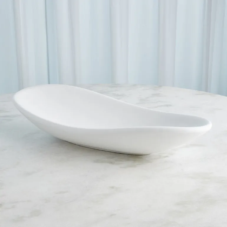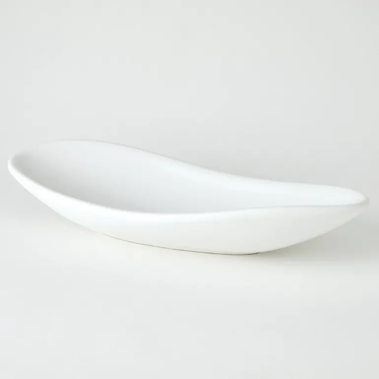 The Flagstone Oblong Centerpiece in white is crafted from slip-molded Portuguese ceramic, making it an ideal choice for displaying beloved items.