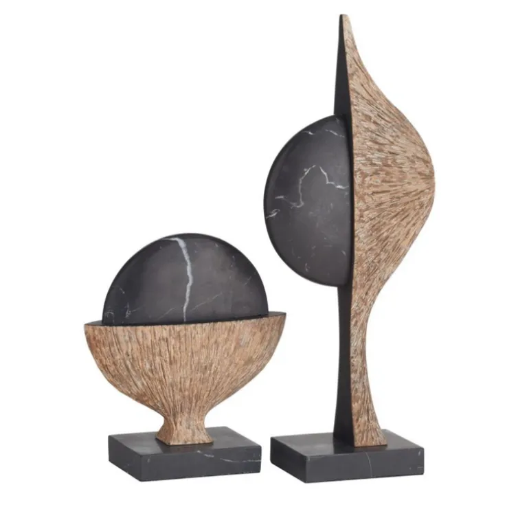 Black marble discs peek out from textural “pods” of ash-brown resin to resemble peas emerging from their shells. Each modernist inspired sculpture is anchored by a sturdy base of black marble. Finish will vary.