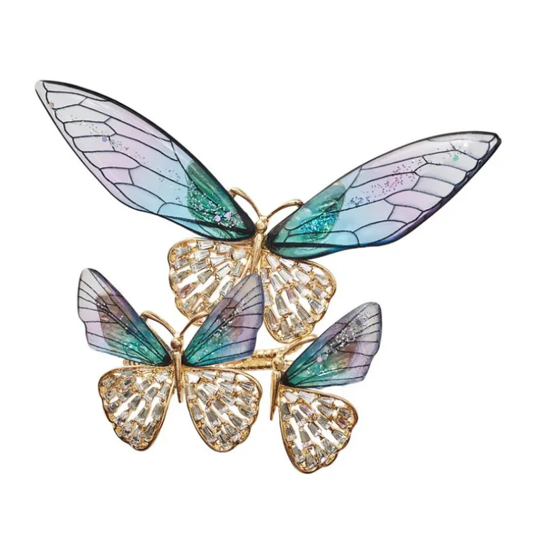 The Flutter Napkin Ring features a set of three butterflies that appear to be about to take flight. Delicate, transparent acrylic wings in lilac and periwinkle sit atop encrusted rhinestone wings. This stunning handmade metal and jeweled napkin ring is sure to shine.