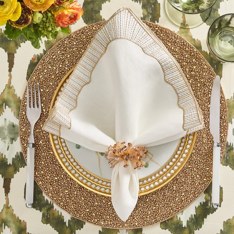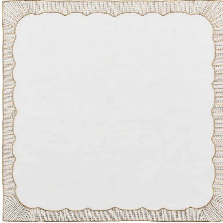 The Frame Napkin is a fresh take on a classic gold and silver napkin. Radiating gold and silver embroidery frame these crisp linen napkins. Pair them with coordinating Frame Cocktail Napkins for a cohesive, chic look. The metallic accents on these napkins give a formal, special occasion vibe such as anniversaries, milestone birthdays and weddings.