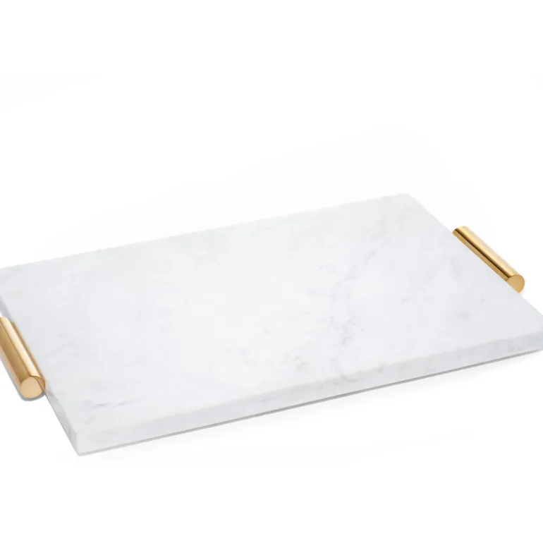Minimal and sophisticated, this beautiful cheese board by Aerin, in sleek white marble, accentuated with tubular brass handles, is a stylish addition to a tabletop. A classic piece, it is hugely versatile, working perfectly for everyday use as well as for entertaining.