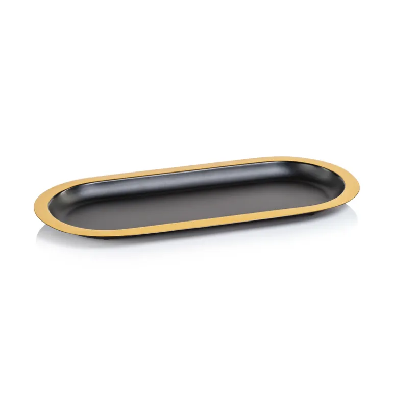 Elevate your serving game with our Black with Gold Border Oval Tray. Its practical design allows you to effortlessly serve drinks and snacks in style. Perfect for parties or everyday use, this tray is a must-have for any home. Make a statement with its sleek black and gold border.