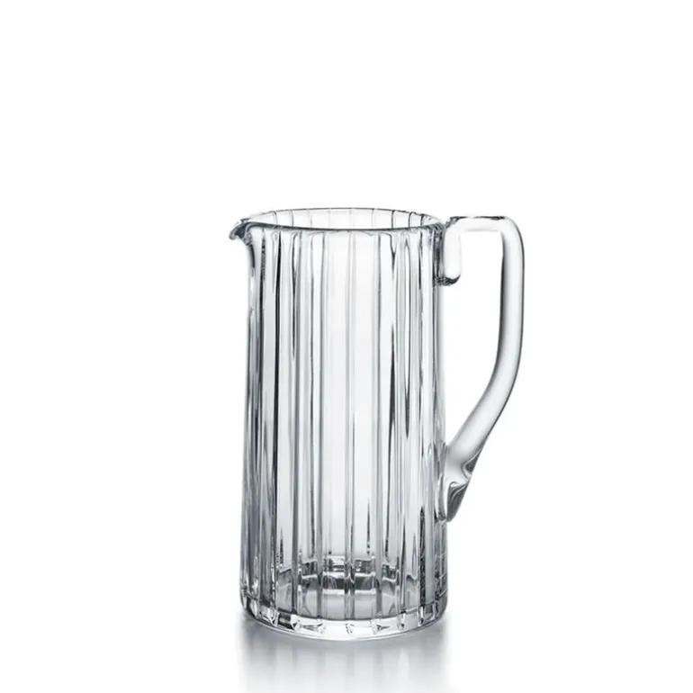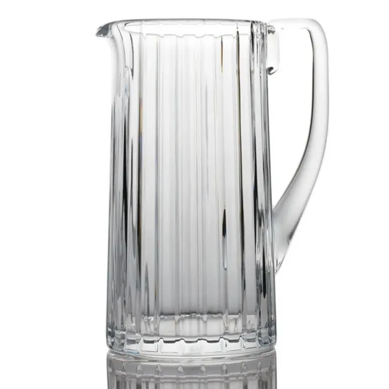 The Harmonie Pitcher has a streamlined silhouette and an elegantly curved handle and spout. Parallel vertical lines travel cleanly along the silhouette finely grazing the clear crystal form from the lip to the base. This linear emphasis evokes a thick Clear crystal column. The stripes are subtly yet precisely etched into the crystal surface, showcasing the three-dimensionality of the pitcher and creating a visual depth to the liquid within.