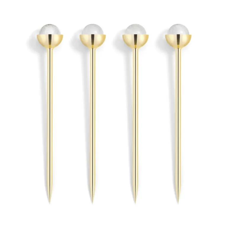 Our Hospitality Cocktail Picks are guaranteed to dress up any drink or appetizer plate and to spark conversation. The Gold and Crystal Gemstone cocktail picks are a fun, chic way to spear olives, maraschino cherries, and appetizers, they are also believed to have helpful properties, like clarity from the crystal. It all adds up to a win-win gift, whether for yourself, or others.