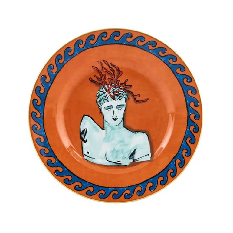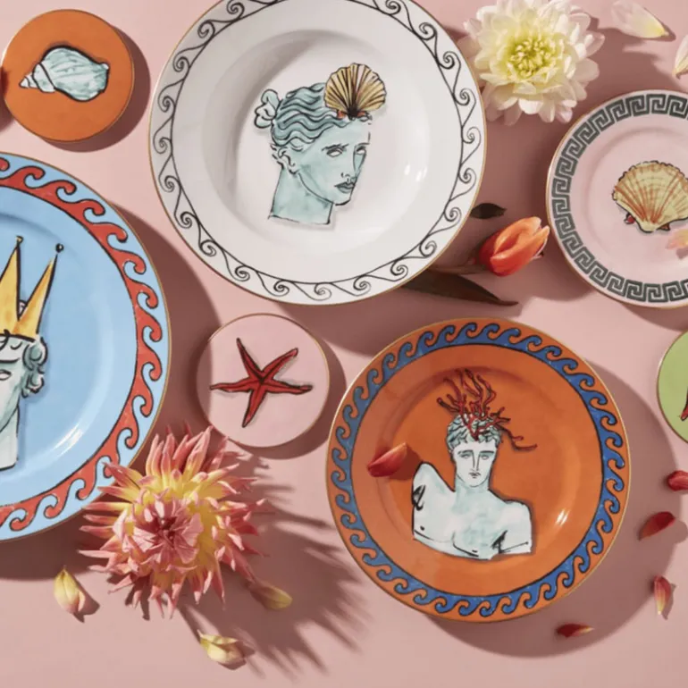 Richard Ginori IL Viaggio di Nettuno collection is inspired by young British designer Luke Edward Hall’s love of Greco-Roman mythology, particularly Neptune, the Roman god of the sea. The collection represents a whimsically unconventional vision of the art of the table – a dialogue between classical and modern with drawings of the gods decorating tableware and home decor items in bold unexpected colors infusing the chinaware with personality. With Il Viaggio di Nettuno collection, Richard Ginori reinterprets the table in a modern vein with uniquely designed objects that are veritable artistic installations.
