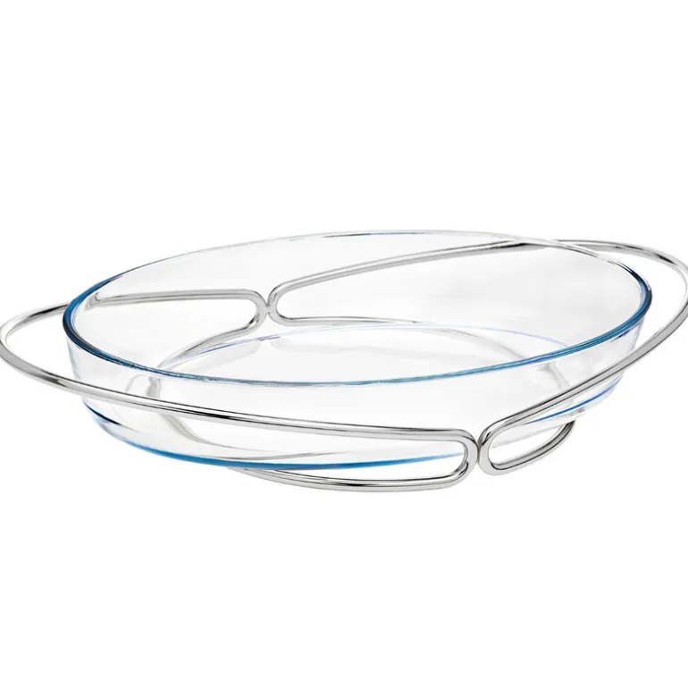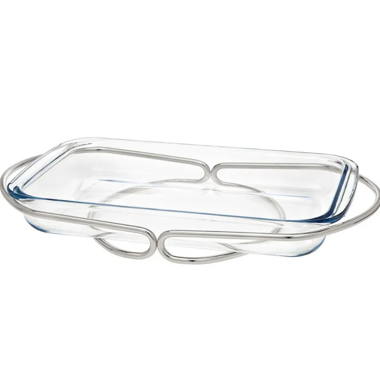 A must have in the kitchen and for serving a group. These oven safe, glass cooking pieces fit perfectly into the modern silver holder making them an attractive way to take hot food straight from the oven to the table. This two-piece baker includes the the oven safe glass for preparing meals.