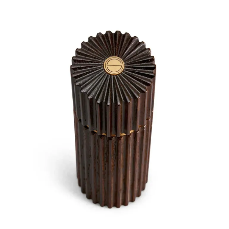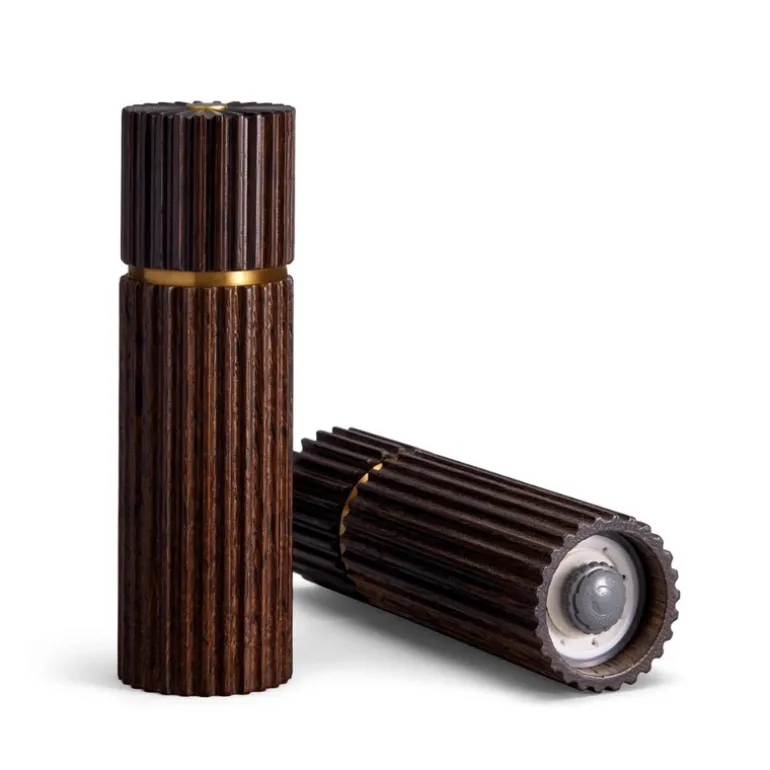 This Ionic salt and pepper mill set of 2 is carefully crafted from natural European oak and smoked oak with brass accents, and designed with a durable metal grinding mechanism.