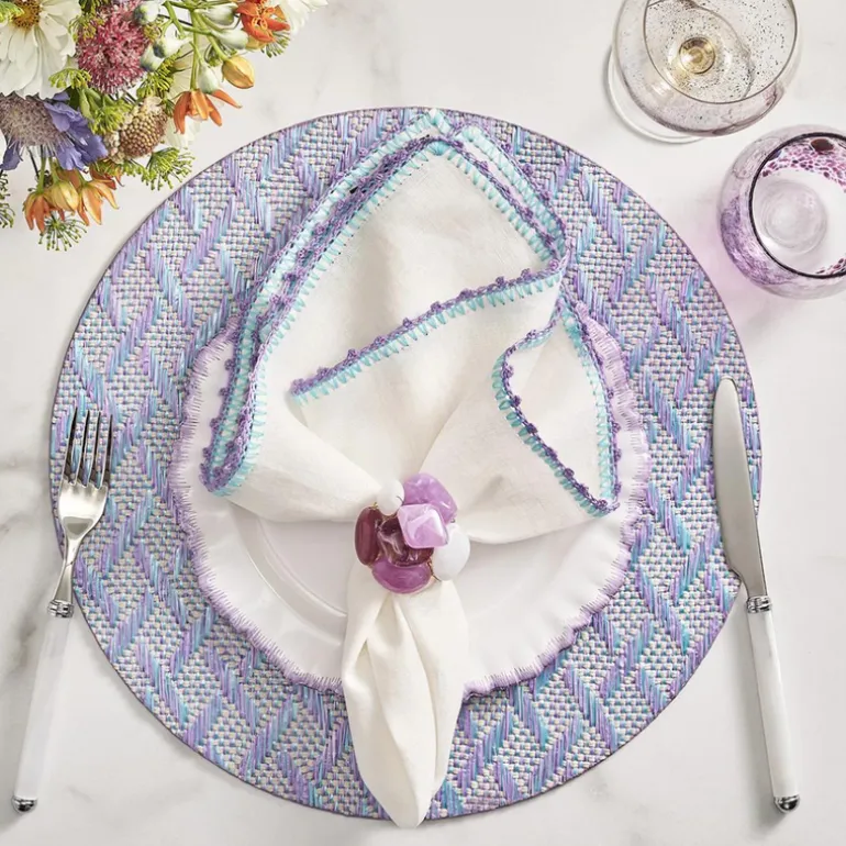 The Knotted Edge Napkin is a luxurious white napkin with two-tone, hand-crocheted edging. The lilac and blue trim “pop” against the clean white background of the linen napkin. The versatility and whimsical design make them the perfect napkins for any fun and festive party.