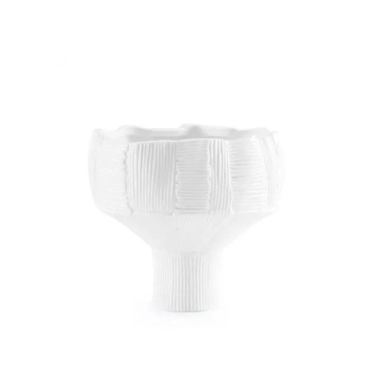 The Krissa Vases are a contemporary collection in Blanc de Chine porcelain. Playing with ordinary utilitarian shapes and materials, our artisans have created these pieces with a patchwork texture of alternating horizontal and vertical lines which is wittily reminiscent by corrugated cardboard. The Krissa Collection includes a tall silhouette and a lower silhouette. Glazed on the inside, with a matte finish on the exterior, the vases serve as tabletop decor or as useful catch-alls. They are completely hand made and come with felt feet making them safe for any surface.