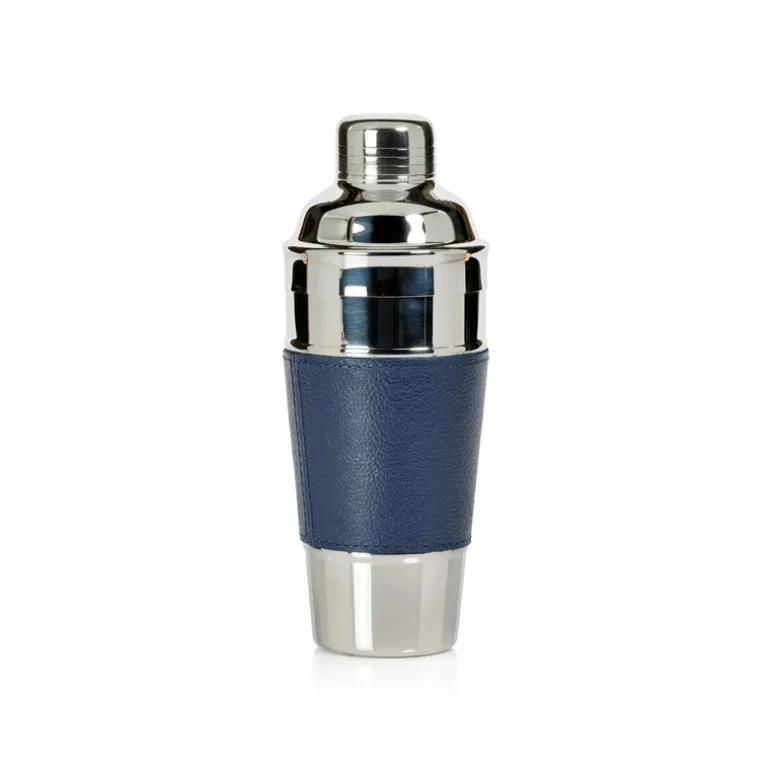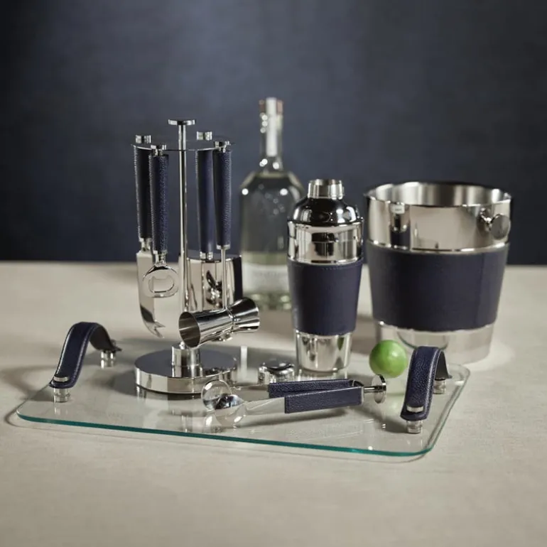 The Laguna Collection has a grouping of bar friendly items made of nickel and navy leather wrapped detailing. The Shaker is the perfect accessory for any cocktail lover,