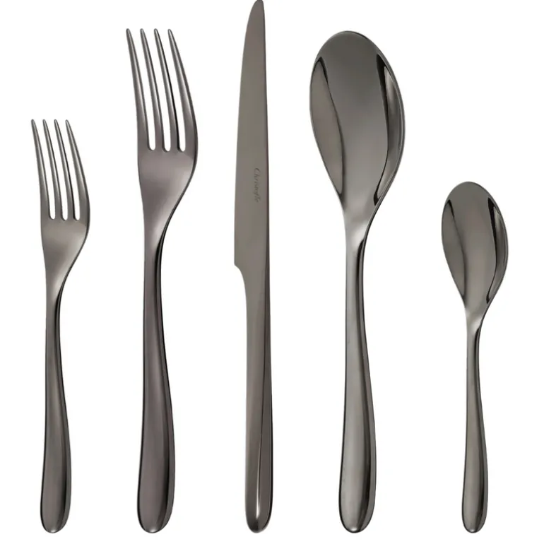 This stainless steel 5-piece place setting in black is the perfect addition to any dinner table. The black coloring is obtained by applying colored metal alloys to the surface of the flatware. This process enhances the pure lines of the flatware and adds an dash of modernity to the finest tables.
