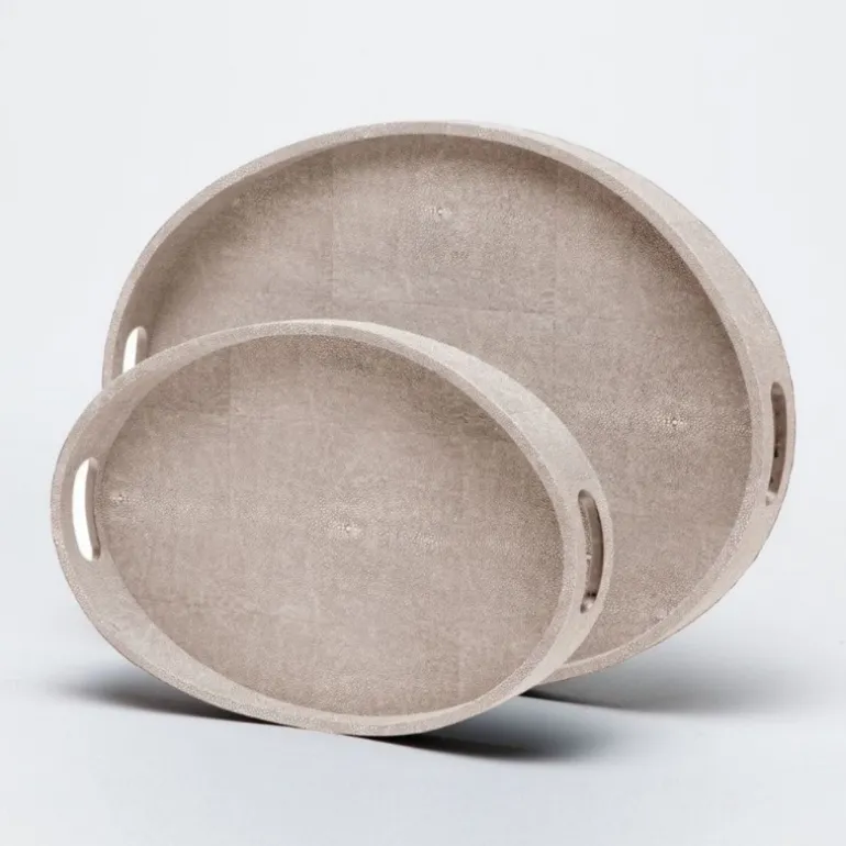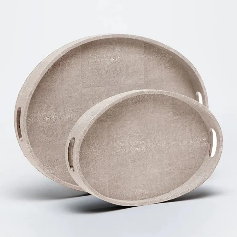 Covered in shagreen with elegantly dipping sides, the Logan is our pretty foray into the world of nonrectangular trays.
