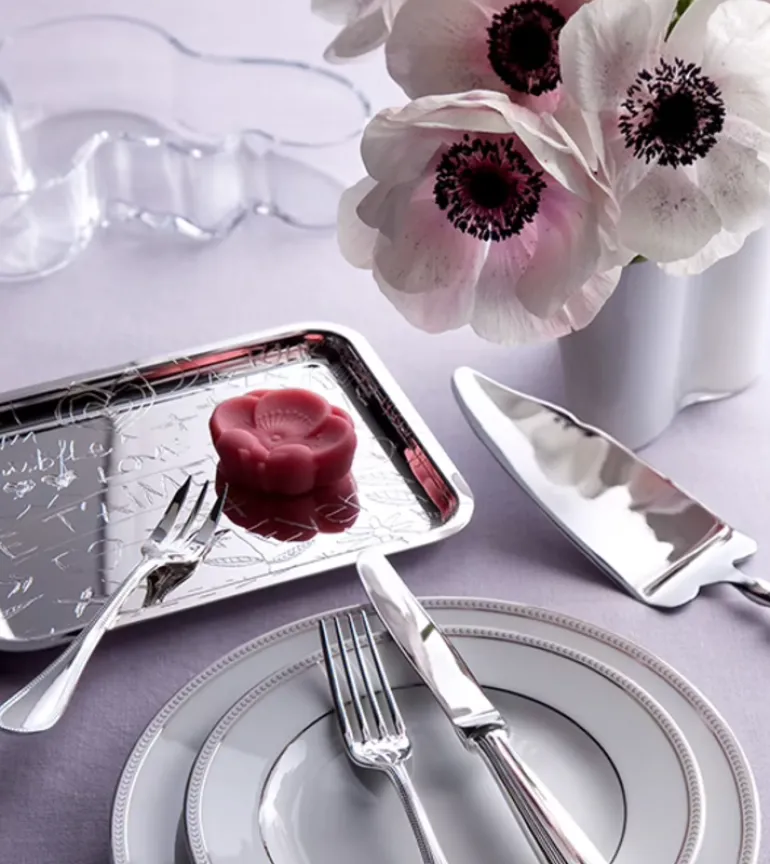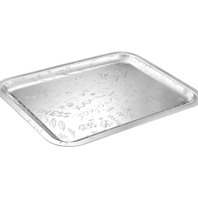Add a dash of visual interest to décor with the silver plated Graffiti serving or display tray with a raised rim and an offbeat design reminiscent of an urban alley or doodled-on notebook from the cofounders of the La Tete Au Cube studio. Peace signs, hearts, flowers and phrases like “je t’aime” (French for “I love you”) make it a perfect gift for pop art appreciators, the young at heart, and teens.