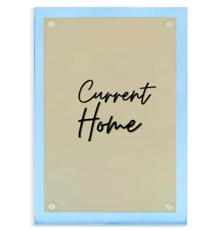 The soothing blue magnetic frame has a matching blue back and transparent lucite acrylic front allowing your photo to float.