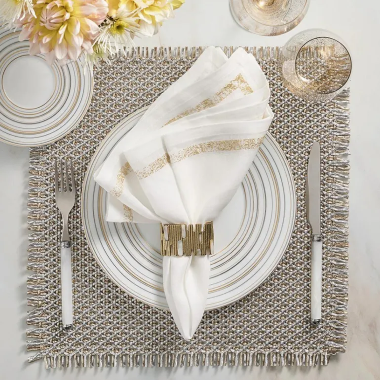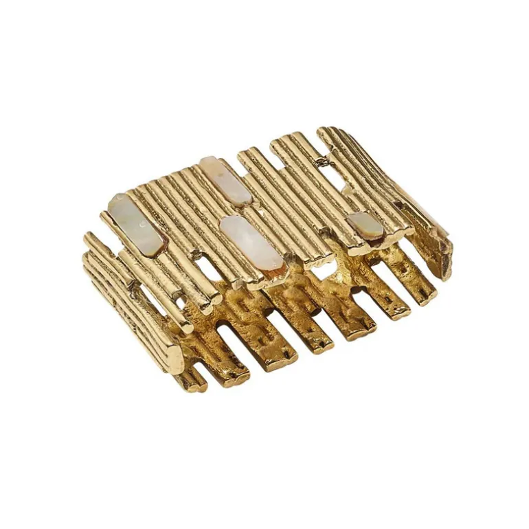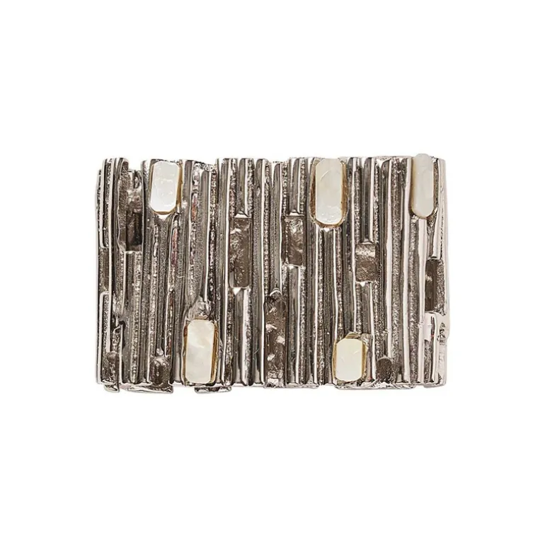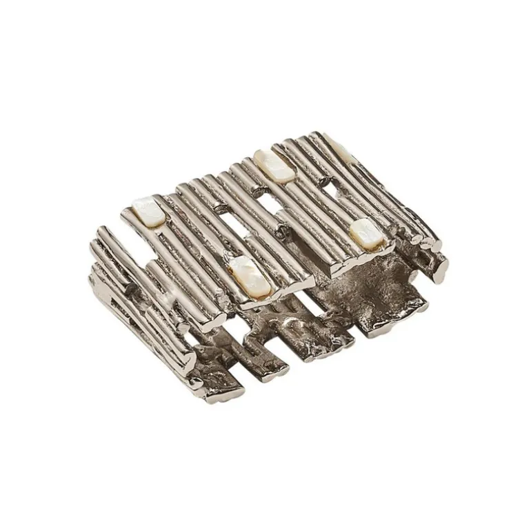 The Matrix napkin ring is a statement piece with its elongated cast brass cuff adorned with hand-attached mother-of-pearl. It has a textured border that creates an eye-catching high- low effect. The luxurious blend of silver-colored metal and mother-of-pearl pieces, combined with the organic design, makes the Matrix napkin ring stand out on any dinner table.