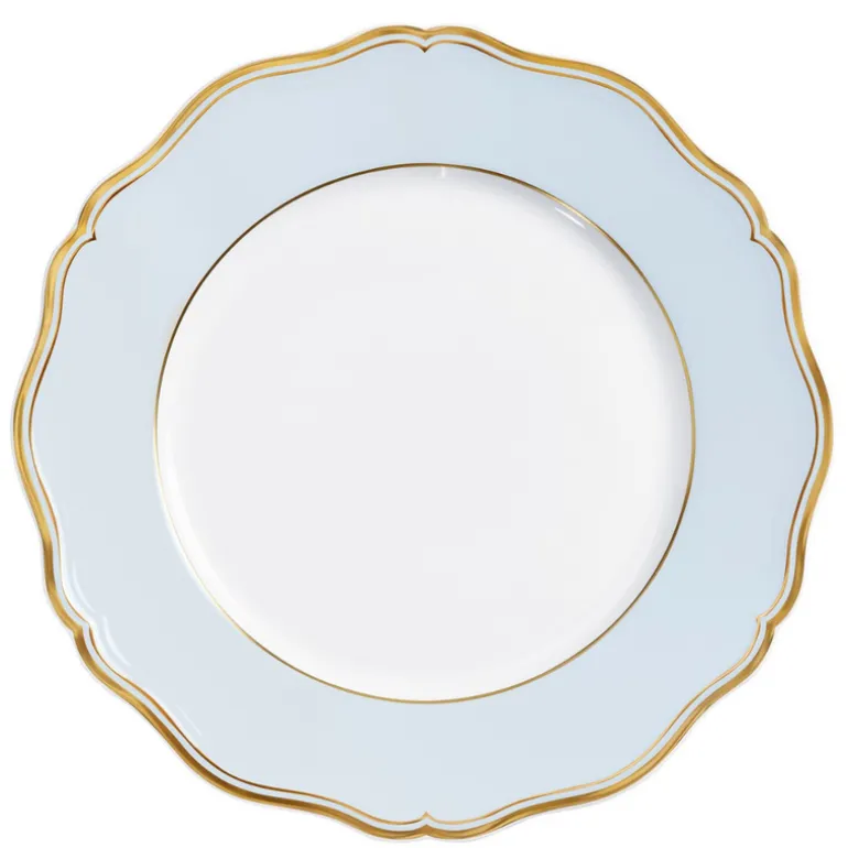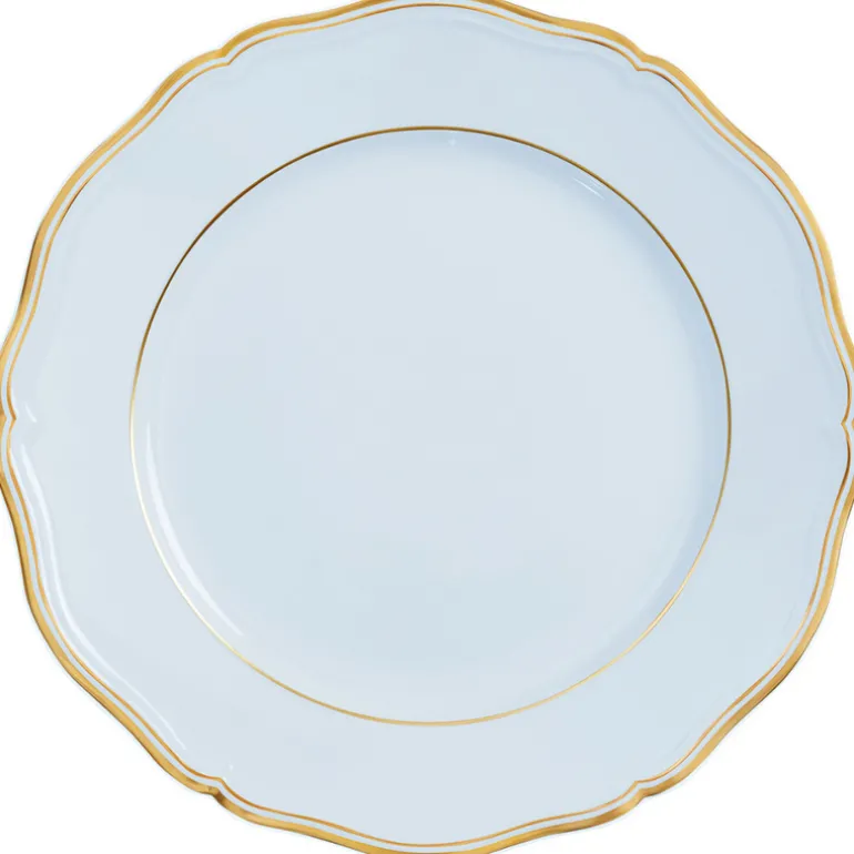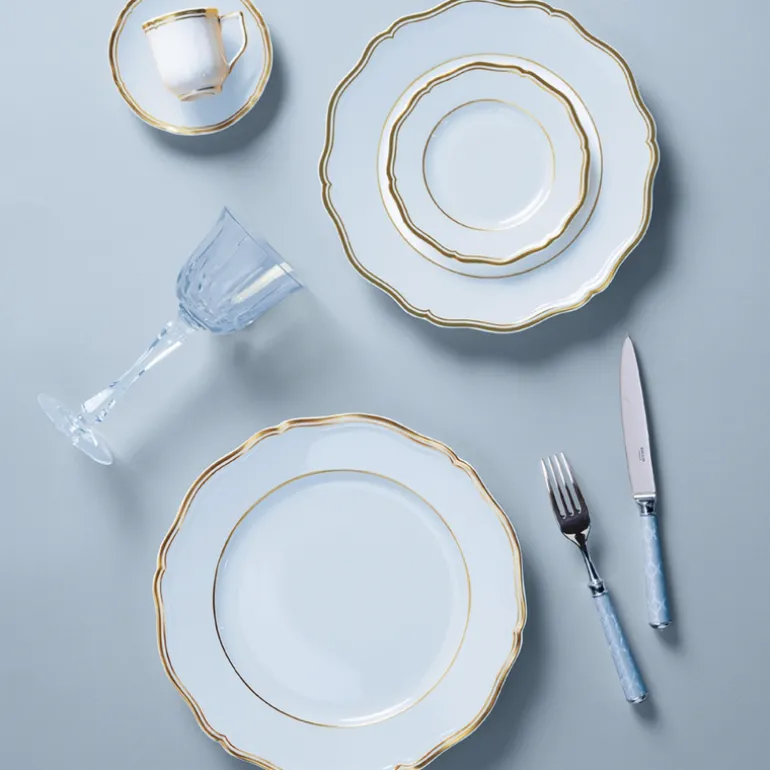 The Mazurka Gold & Blue Grey dinnerware set includes dinner plates, dessert plates, and charger plates with a timelessly beautiful gold-and-blue-grey color palette. The plates are made from high-quality porcelain with a reinforced rim, making them both durable and dishwasher-safe. The intricate design is perfect for formal occasions and special events.