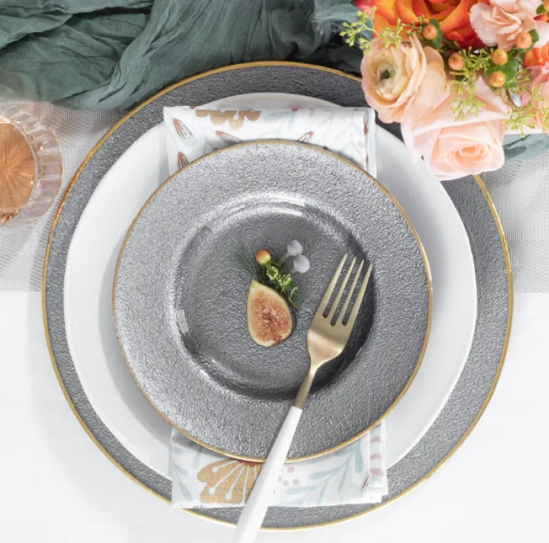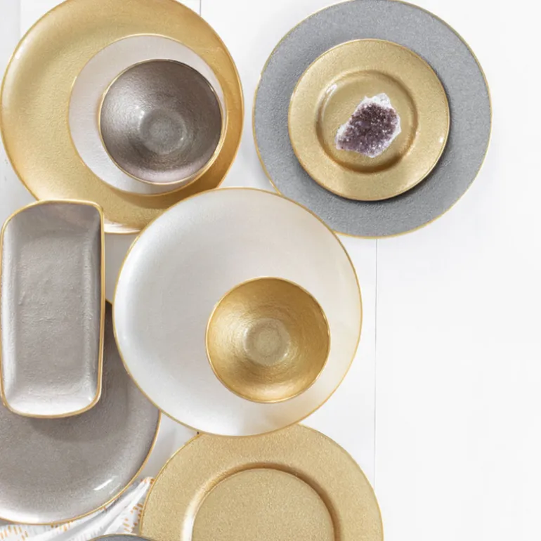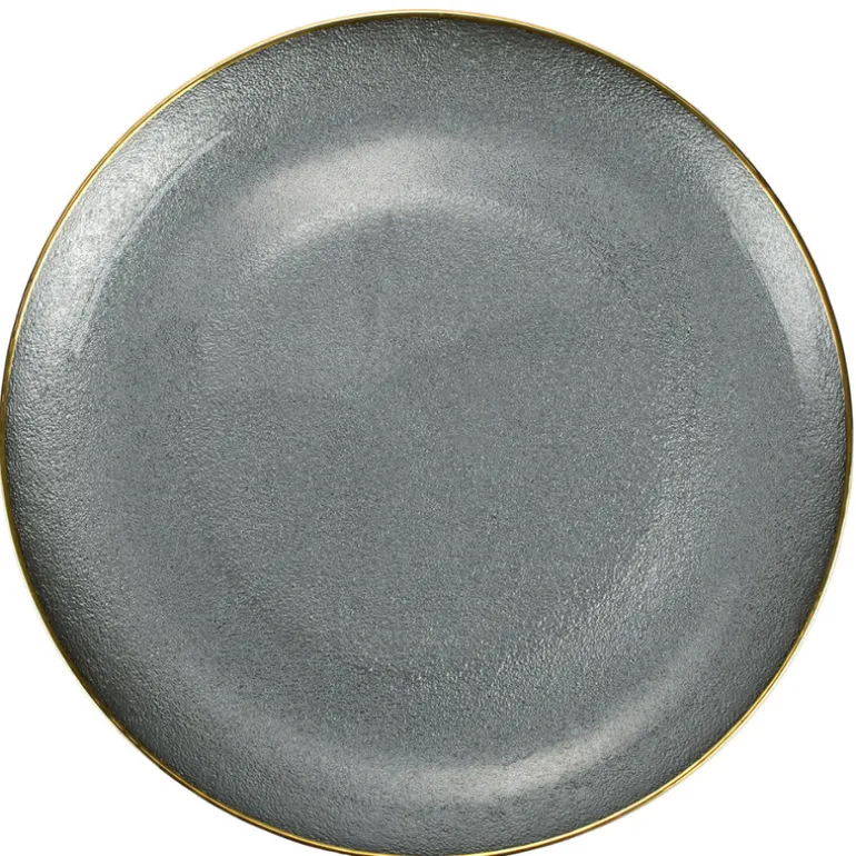 The metallic glass platter in slate is timeless and modern. With a beautiful, molten effect, each piece is rimmed in gold and instantly elevates any table setting. The Metallic Glass Slate Platter exudes timeless glamour and is a statement piece on its own. Other sizes are available