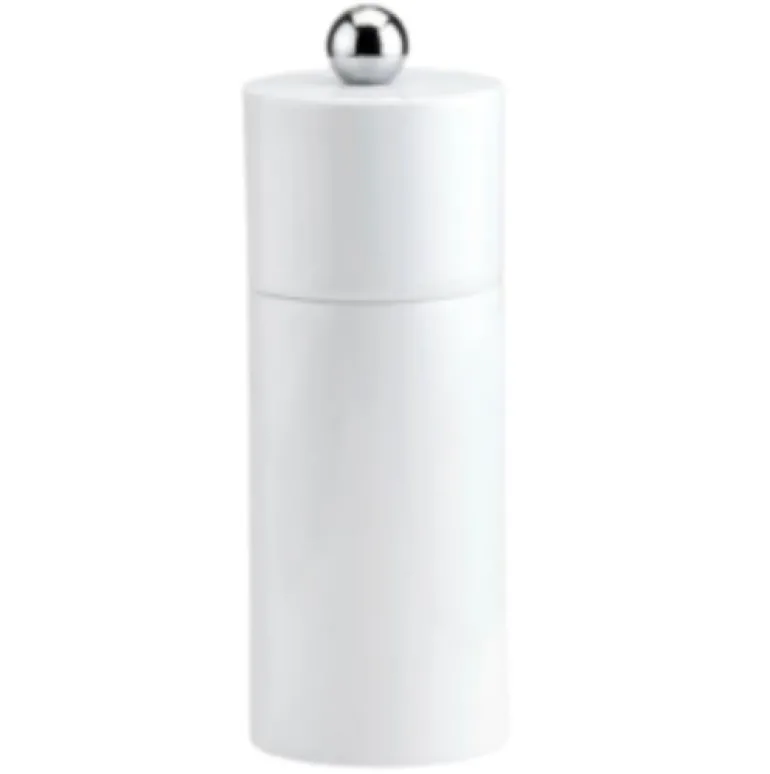 This unique design by Addison Ross, the Mini Pillar Salt & Pepper Shaker, features a round column mill with a white lacquered finish. It comes with interchangeable stainless steel screw knobs, allowing you to easily switch between using it as a Salt Grinder or a Pepper Grinder.