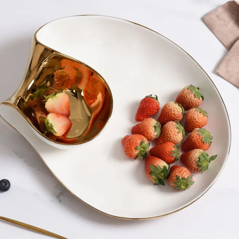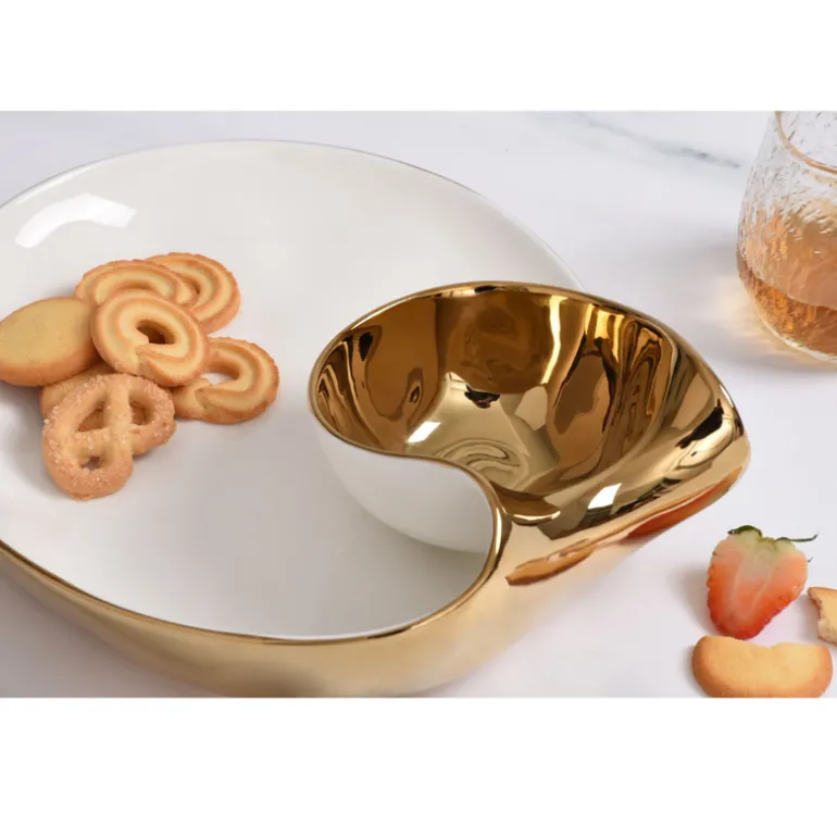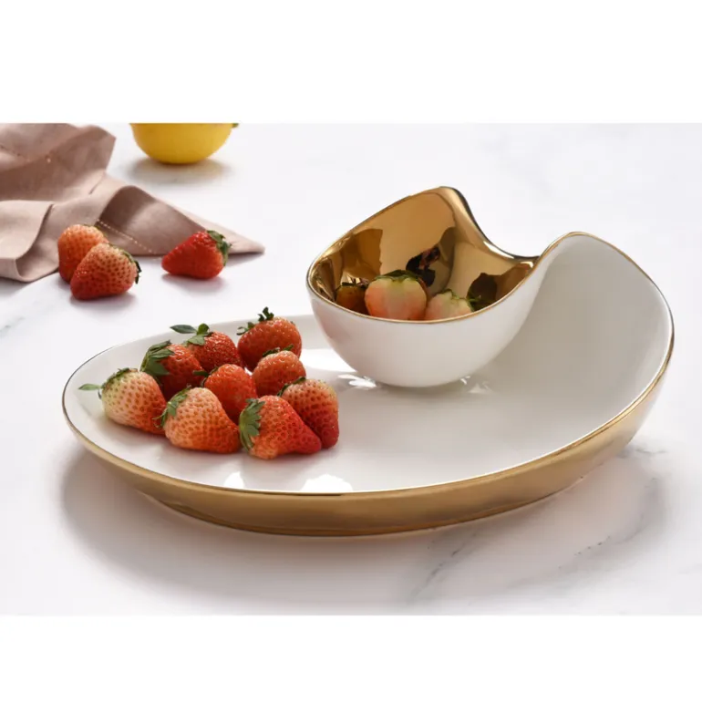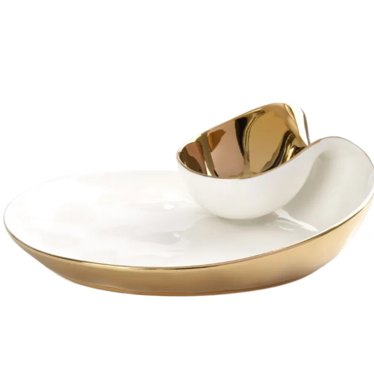The Moonlight Chip & Dip is crafted from luxurious white high-fired porcelain and adorned with dazzling gold titanium for a modern take on the classic chip and dip combination. Enjoy a variety of snacks from hummus and pita to salsa and tortilla chips, veggies and ranch, or berries and whipped cream. This piece also makes a stunning display for sushi and soy sauce or crab cakes and tartar sauce.