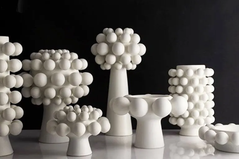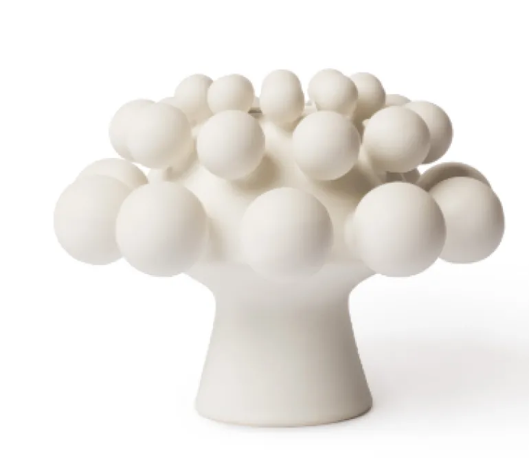 The Dome vase is part of the sculptural, hand made nimbus collection. The cloud-like, hand-appliqued, vessels are brimming with “blooms”. They make a bold statement on a bedside table or cocktail table.