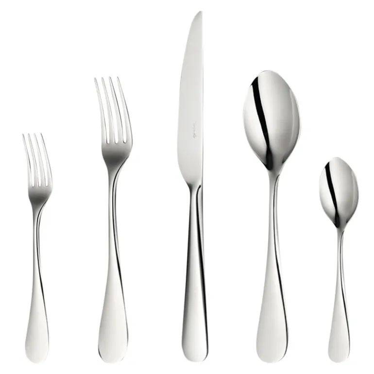 - This 5-piece stainless steel Albi flatware set contains one tablespoon, dinner fork, dinner knife, salad fork, and coffee/tea spoon.